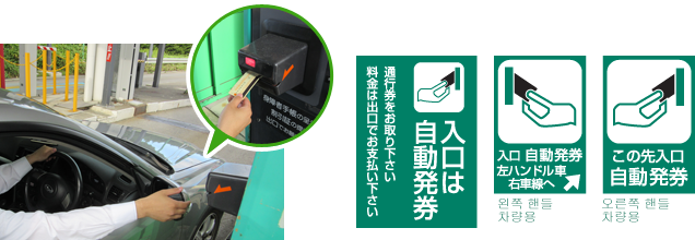 ②입구 톨게이트에서 자동 티켓 발행기의 톨게이트 패스를 뽑습니다. 티켓에는 차량 유형, 진입한 인터체인지 이름, 발행된 날짜와 시간 및 기타 정보가 표시됩니다. (*일부 입구 톨게이트에서는 현금 결제가 가능합니다.)